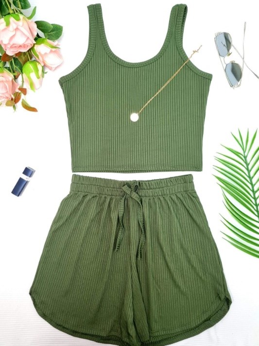 Conjuntos Cropped Top Simples básico Regata+Short Curto Malha Canelada Várias Cores – R$ 28,99 (-42%)