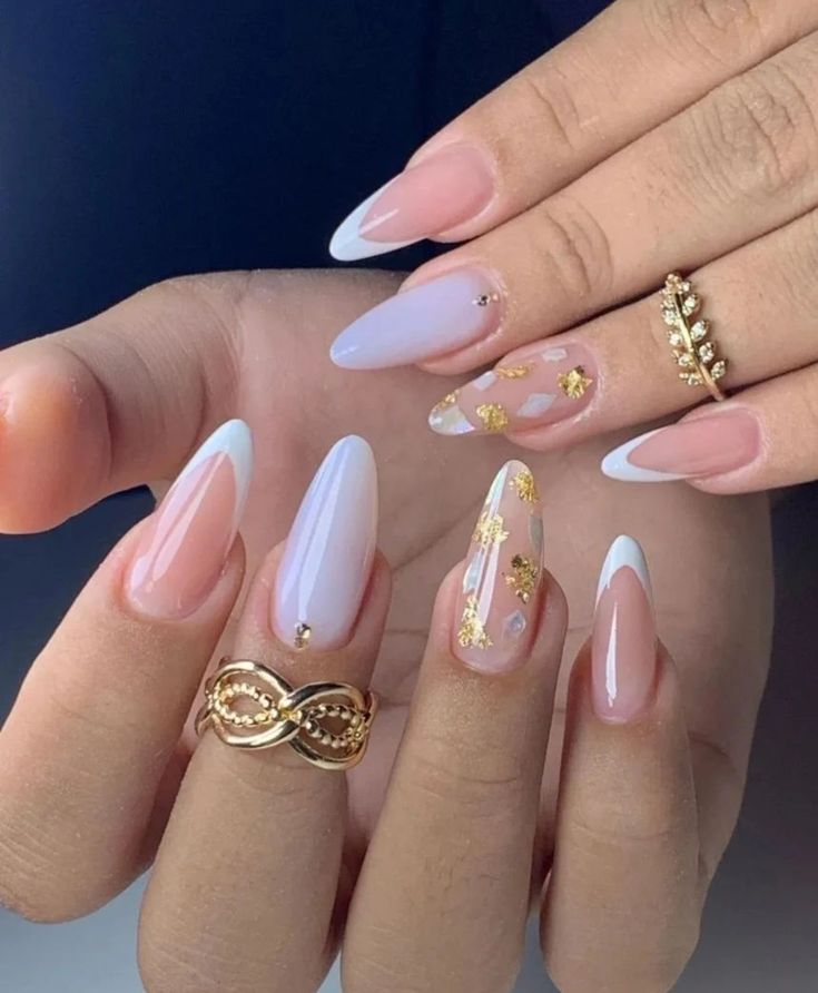 Pinte algumas unhas de lilás e outras de nude. Utilize um pincel fino para desenhar flores delicadas com esmalte branco e dourado nas unhas nude. Para finalizar, aplique uma camada de top coat.