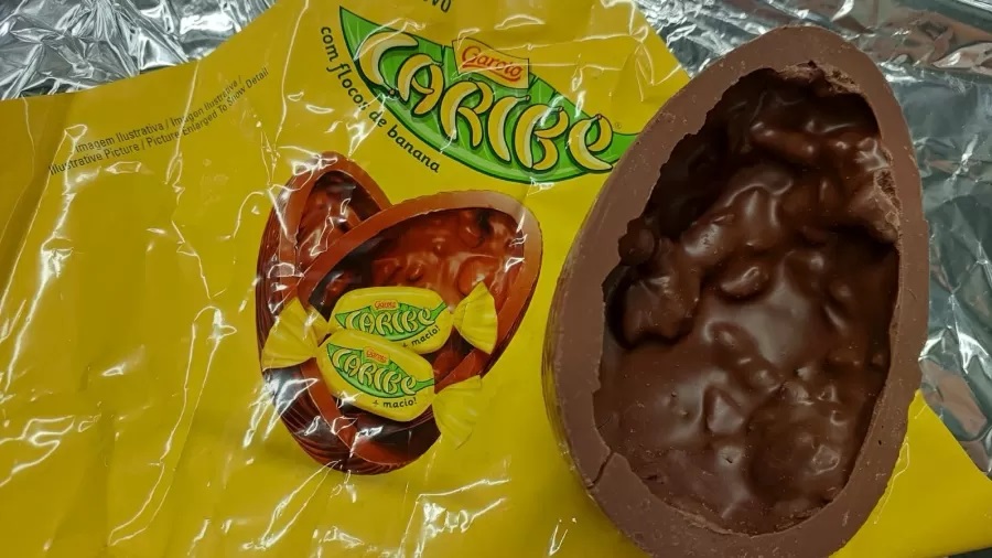 Este ovo combina o tradicional chocolate ao leite com flocos de banana, criando uma textura única que homenageia o já consagrado bombom Caribe.