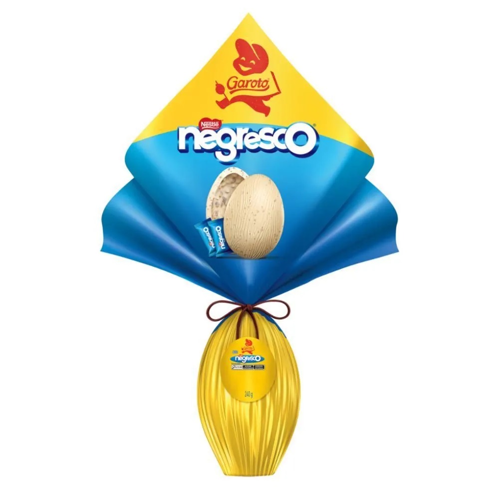 Envolvida em tons de amarelo e azul, assim como na barra de chocolate, a embalagem faz referência direta à barra de chocolate Negresco. Esse Ovo de Páscoa também é encontrado na faixa dos R$ 50.