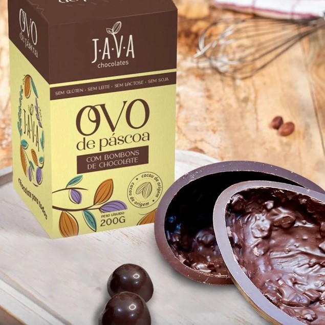 Fechando nossa lista de marcas com Ovos de Páscoa veganos, a Java Chocolates busca se diferenciar pela produção de chocolate bean to bar, um método que controla todo o processo, desde o grão de cacau até o produto final.